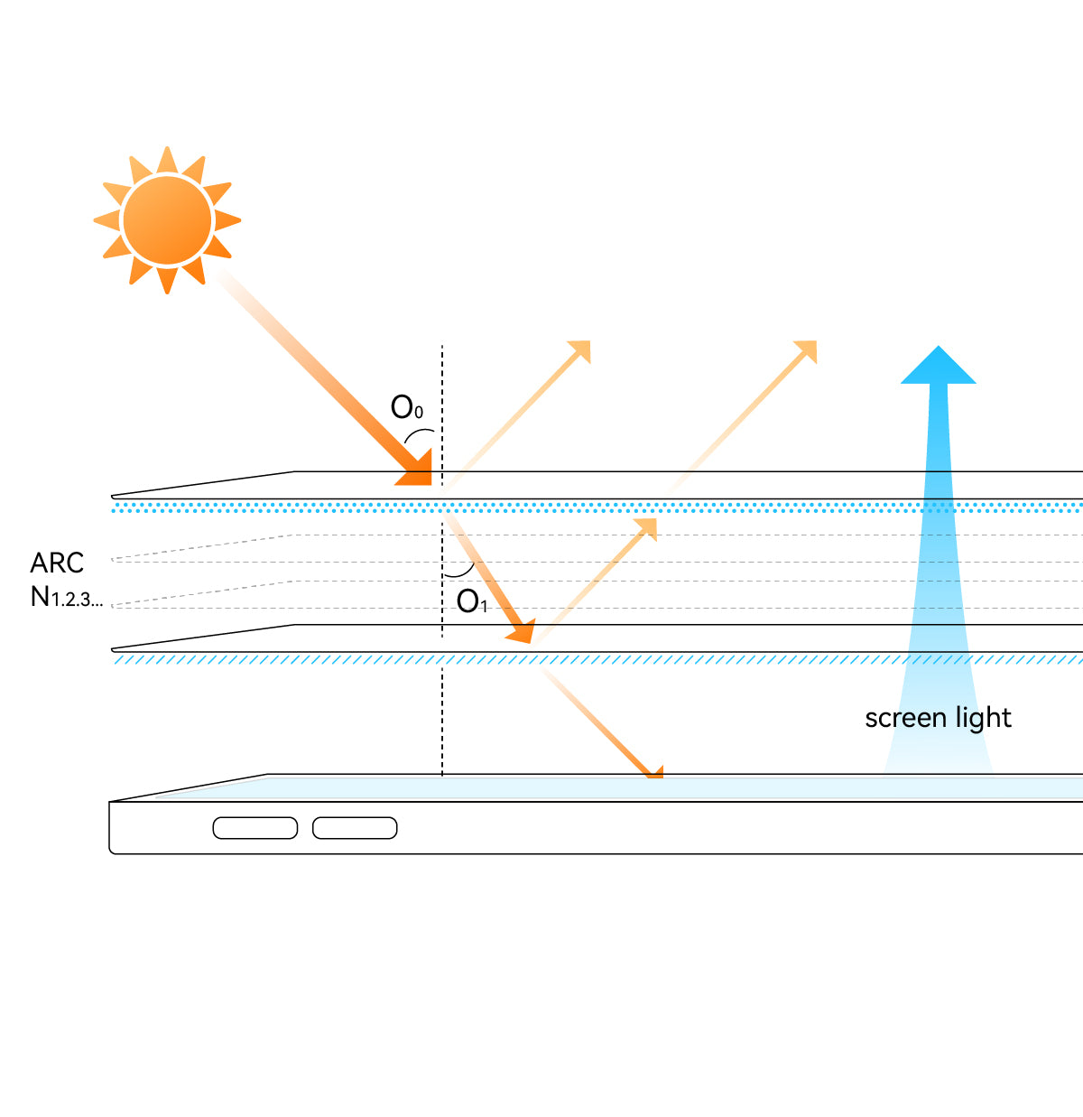 AR (Anti-Reflective) coating uses multi-layer thin-film interference to cancel out reflected light. Each layer’s thickness and refractive index are engineered to create destructive interference for incoming light waves, minimizing surface reflections. At the same time, the light transmittance is greatly improved, which makes the screen show a clearer and more transparent picture.