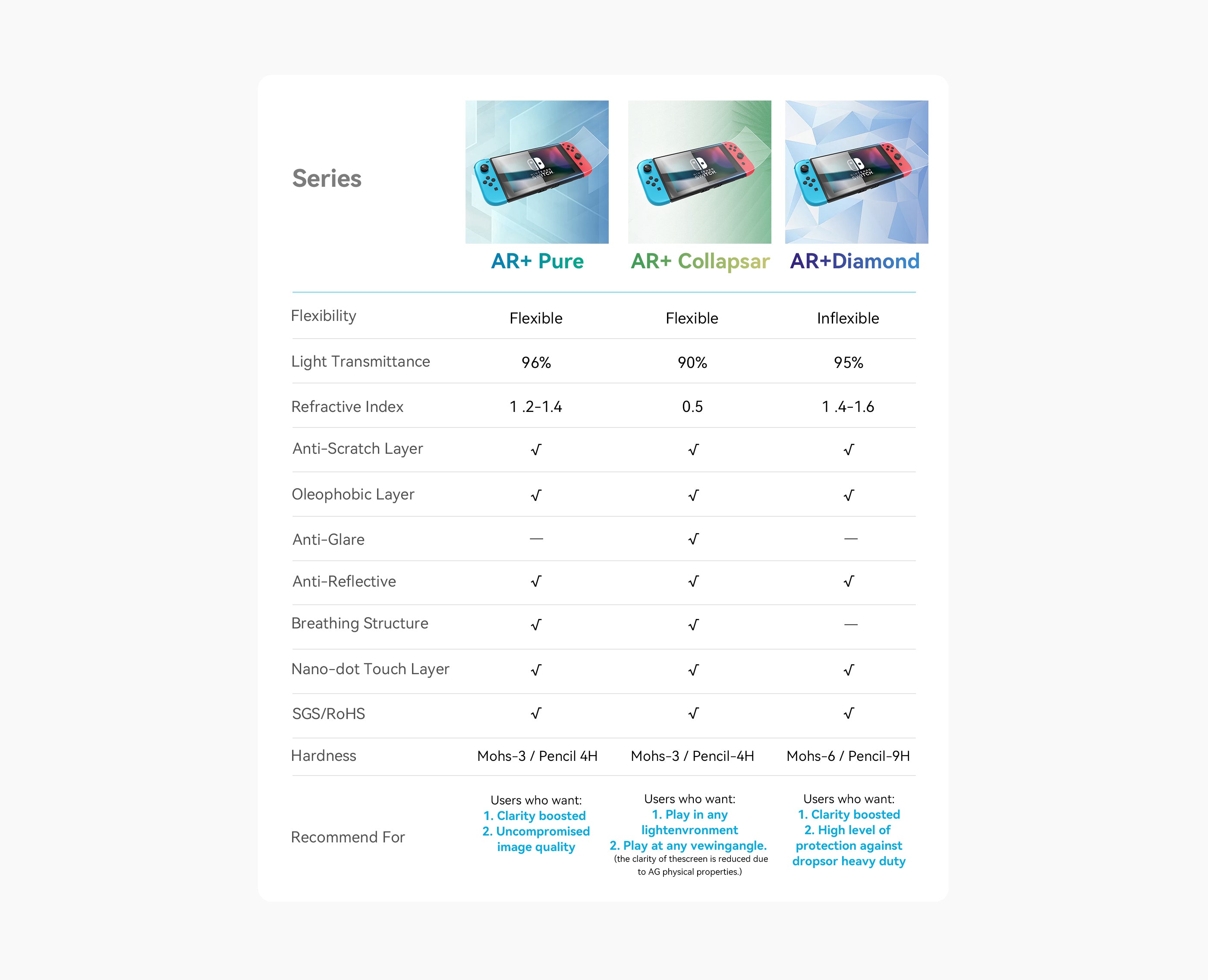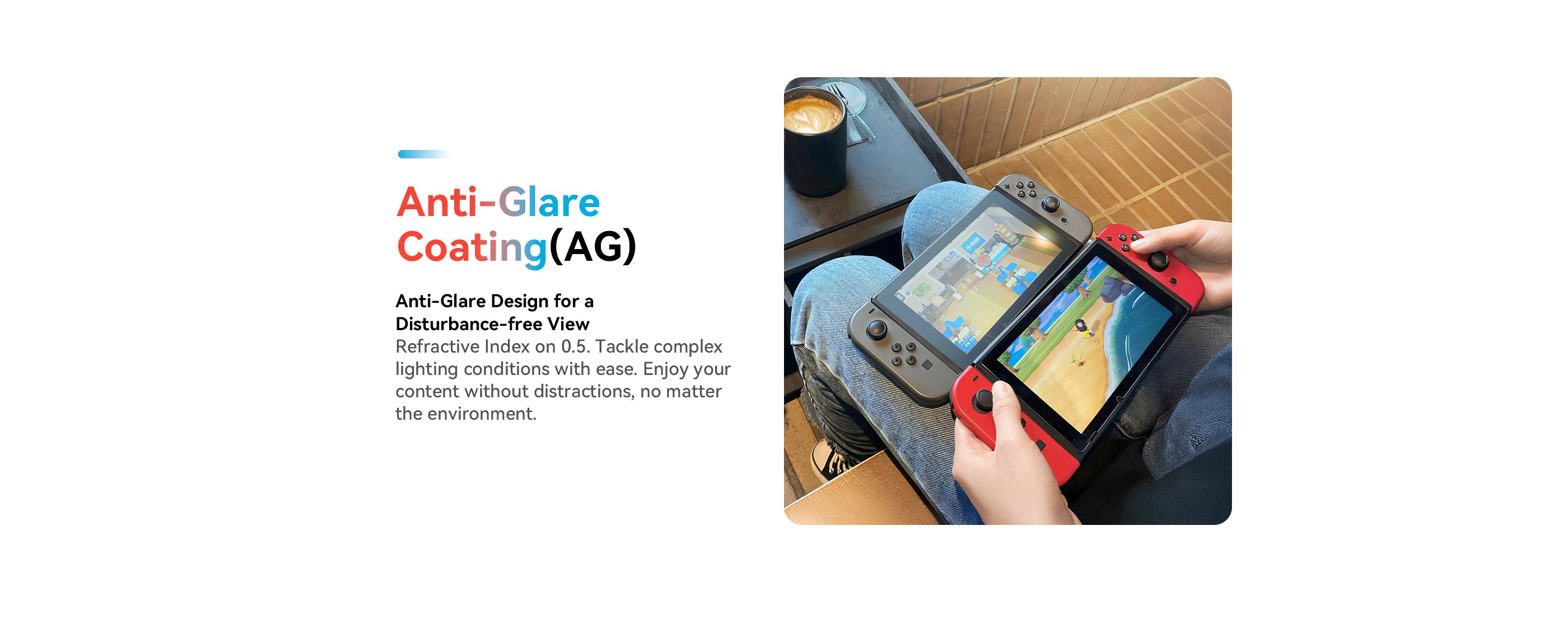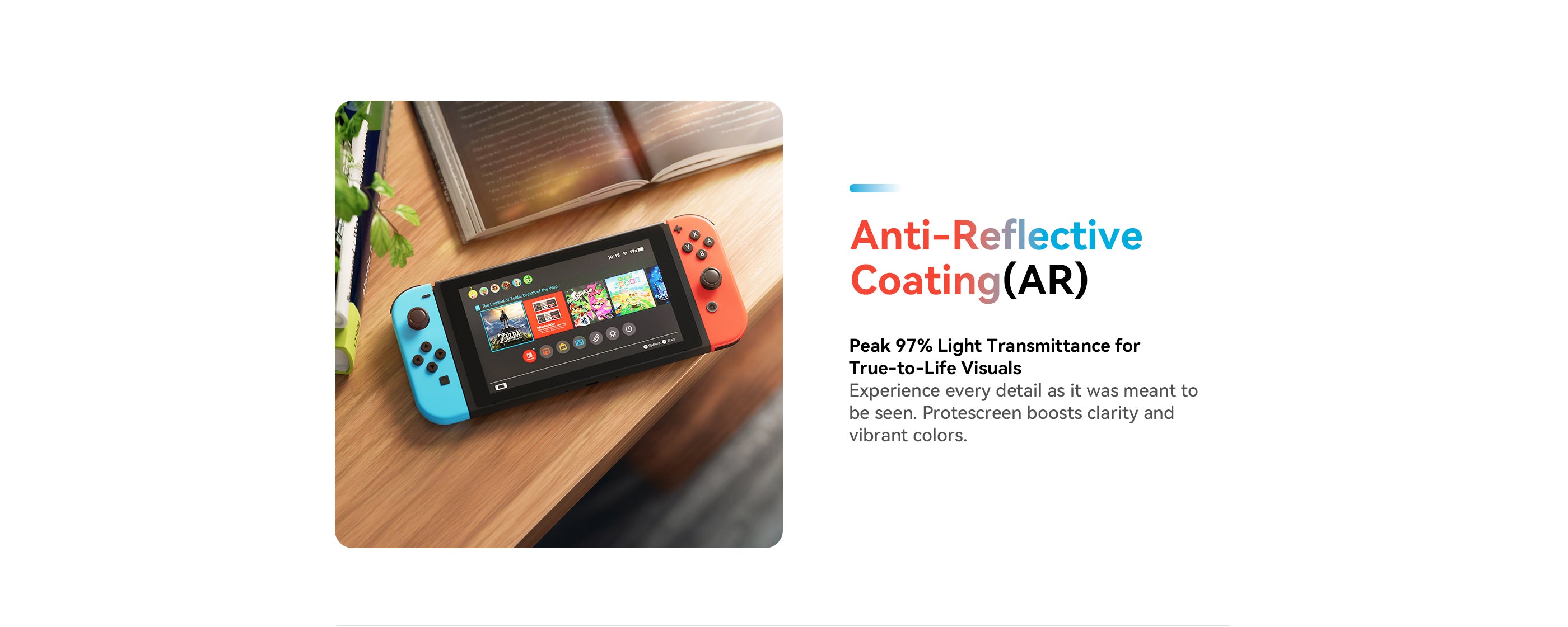 Unleash your Nintendo Switch's true potential with Protescreen AR+ --- the most advanced anti-reflective screen protector featuring breakthrough vacuum sputtering technology. With industry-leading 96% light transmission and 0.3 reflection rate, you'll see your games exactly as they were meant to be seen.