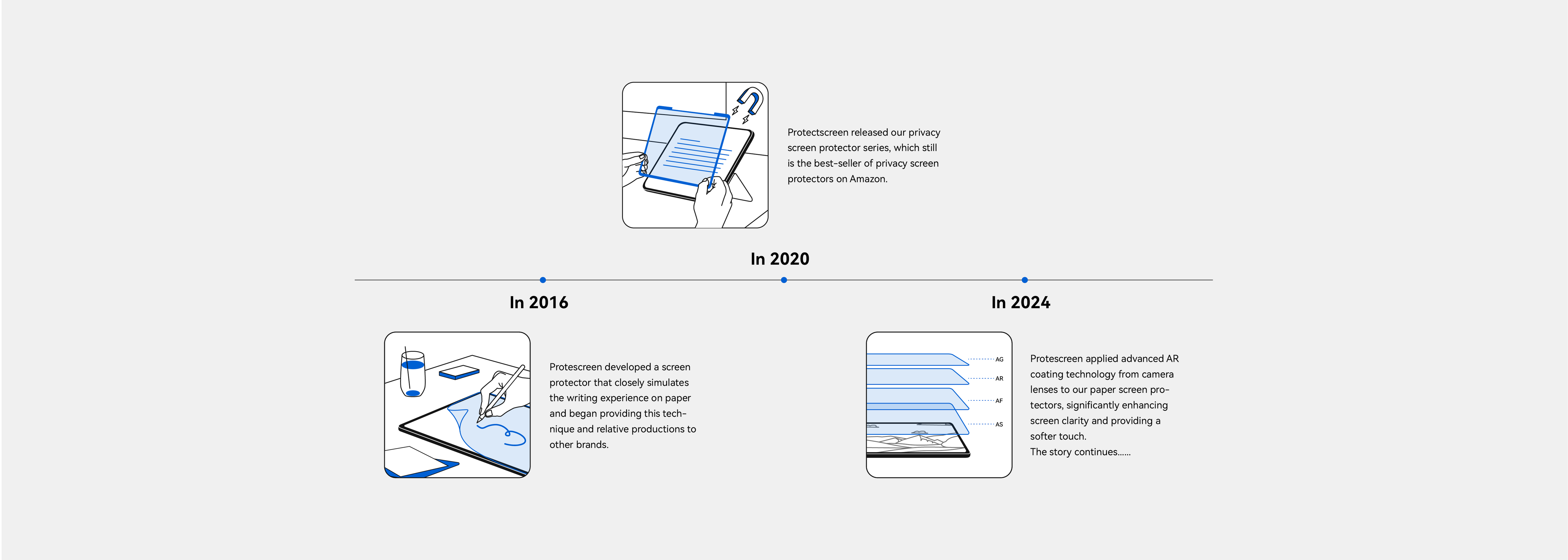 Around the same time, Microsoft researchers were working on a flat capacitive pen and noticed that writing on a glass screen protector didn't feel like writing on paper. They realized they needed to improve the contact surface between the stylus tip and the screen to create a smoother writing experience. Microsoft approached our R&D team at Protescreen for help. After extensive research and development, we introduced paper texture screen protectors, revolutionizing the experience of writing on tablets. These paper texture films have provided a comfortable paperless experience for millions of users and indirectly helped protect nearly 10,000 acres of forest.