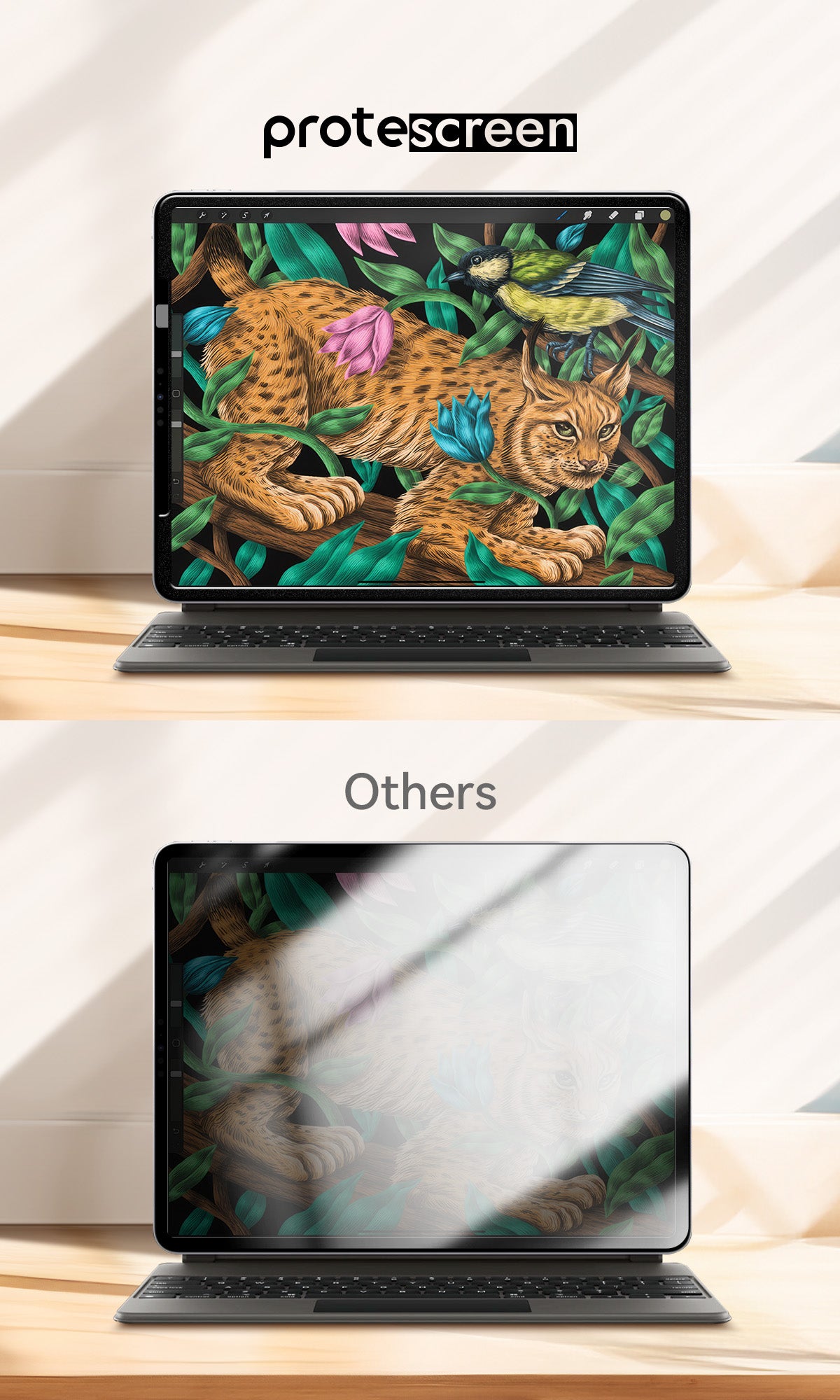 Forget bubbles and sticky messes. NanoGuard features nano adhesion technology—a bubble-free, reusable solution that outperforms magnetic or glue-based screen protectors. Unlike magnetic paperlike films that can interfere with your iPad’s magnetic sensitivity or cause long-term demagnetization. NanoGuard is fully compatible with frequent removals or reapplications. Ideal for artists and professionals who regularly switch between accessories.